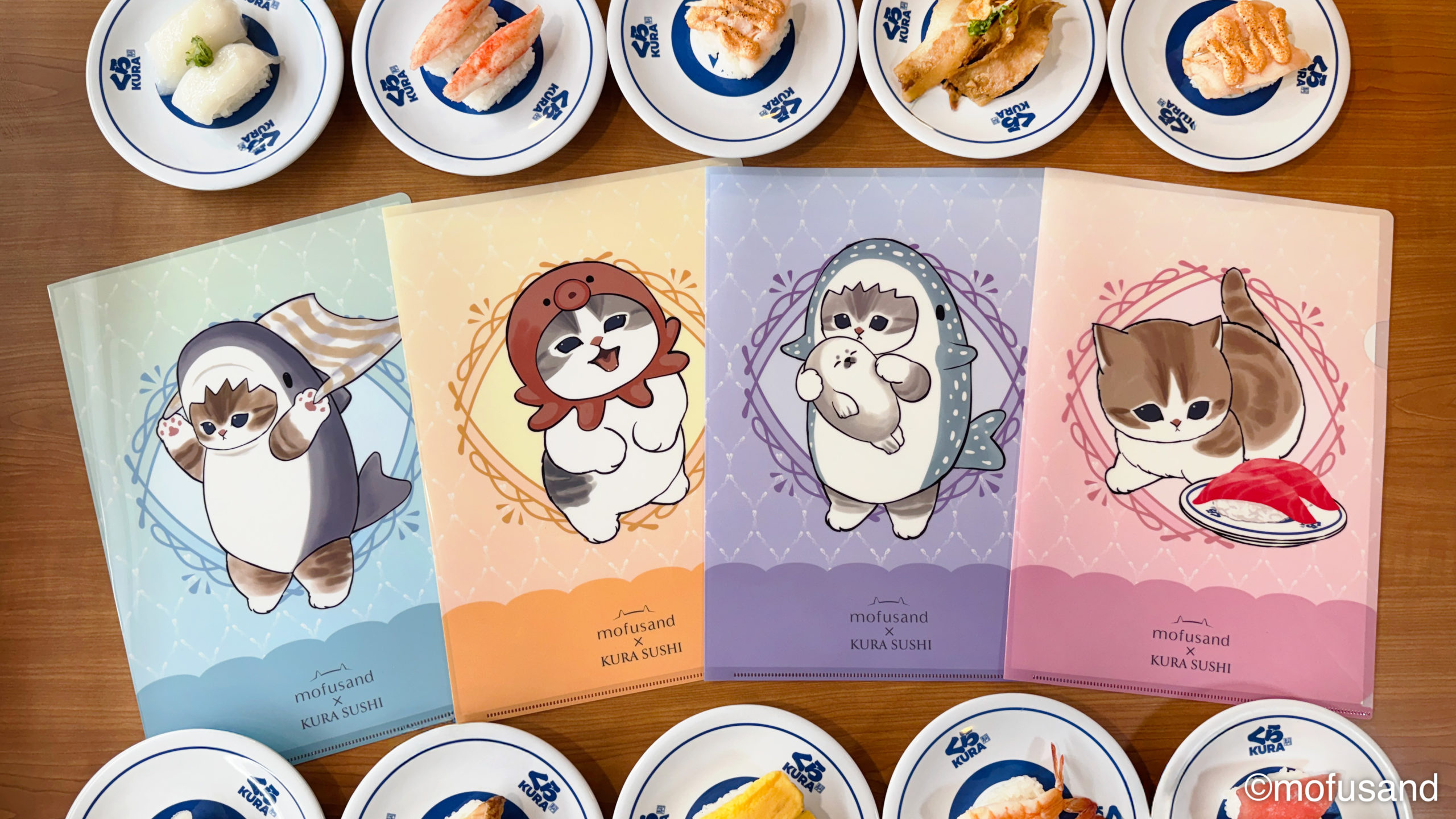 凡於全台店舖消費滿1,000元並追蹤藏壽司官方 Facebook 及加入 LINE 好友並綁定會員,即可獲得「mofusand 貓福珊迪」原創透明文件夾乙個。此次一共推出4款獨家設計包含:淺藍鯨鯊喵、紫色懷緊抱著Q萌小海豹、黃色章魚喵以及靠在美味鮪魚壽司旁的喵,每一款都萌力爆表!