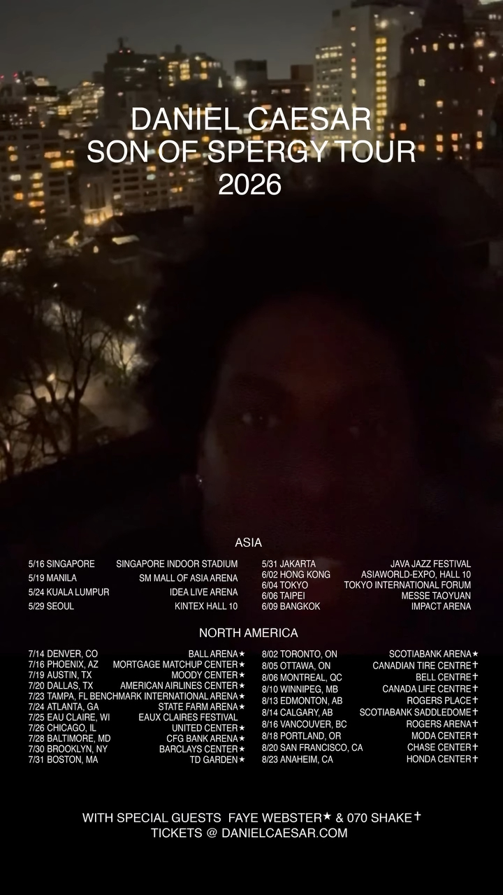 這次 Daniel Caesar 宣布的全新巡迴 SON OF SPERGY TOUR 2026 包括從 5 月 16 日新加坡開始的亞洲場次再到 7 月 14 日於丹佛開跑的北美場次,北美場次包括 Faye Webster、070 Shake 等開場歌手。而亞洲巡迴場次包括了: