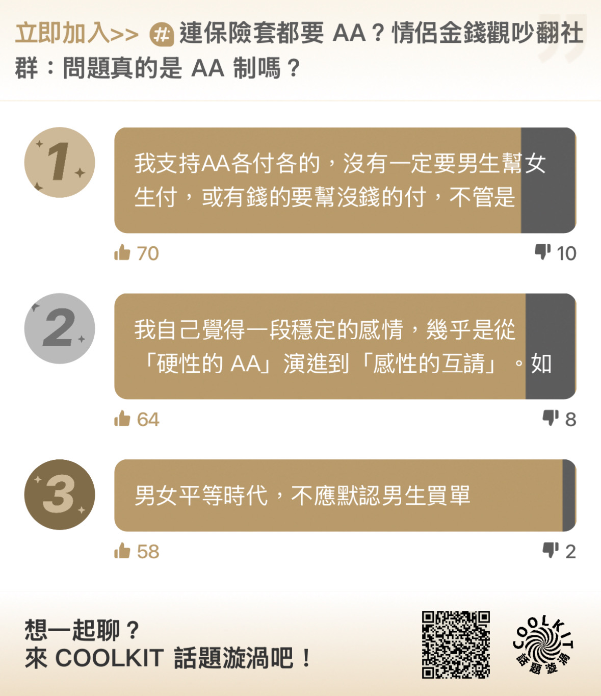 COOLKIT 最大特色,就是把每一篇文章底下,變成一個即時聊天室「話題漩渦」。只要是《COOL》編輯發布的文章,都會自動生成專屬討論空間,讓讀者不只是閱讀,而是能即時留言、交流觀點。無論是贊同、反對,或單純想看看別人怎麼想,都可以在這裡找到回應。
