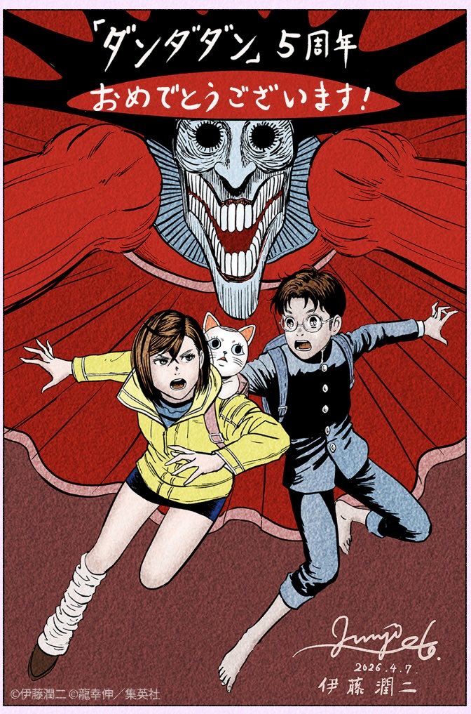 而除了《膽大黨》官方公開的五週年紀念賀圖,就連恐怖漫畫大師伊藤潤二都特別公開了自己繪製的週年紀念賀圖。接下來《膽大黨》動畫第三季預計將於 2027 年正式開播,且官方才剛在前日宣布了《膽大黨》將首次推出真人舞台秀的消息,預計將於 2026 年 8 月、9 月於日本東京及大阪開演,相信接下來《膽大黨》粉絲們還有很多可以好好期待的重磅消息!