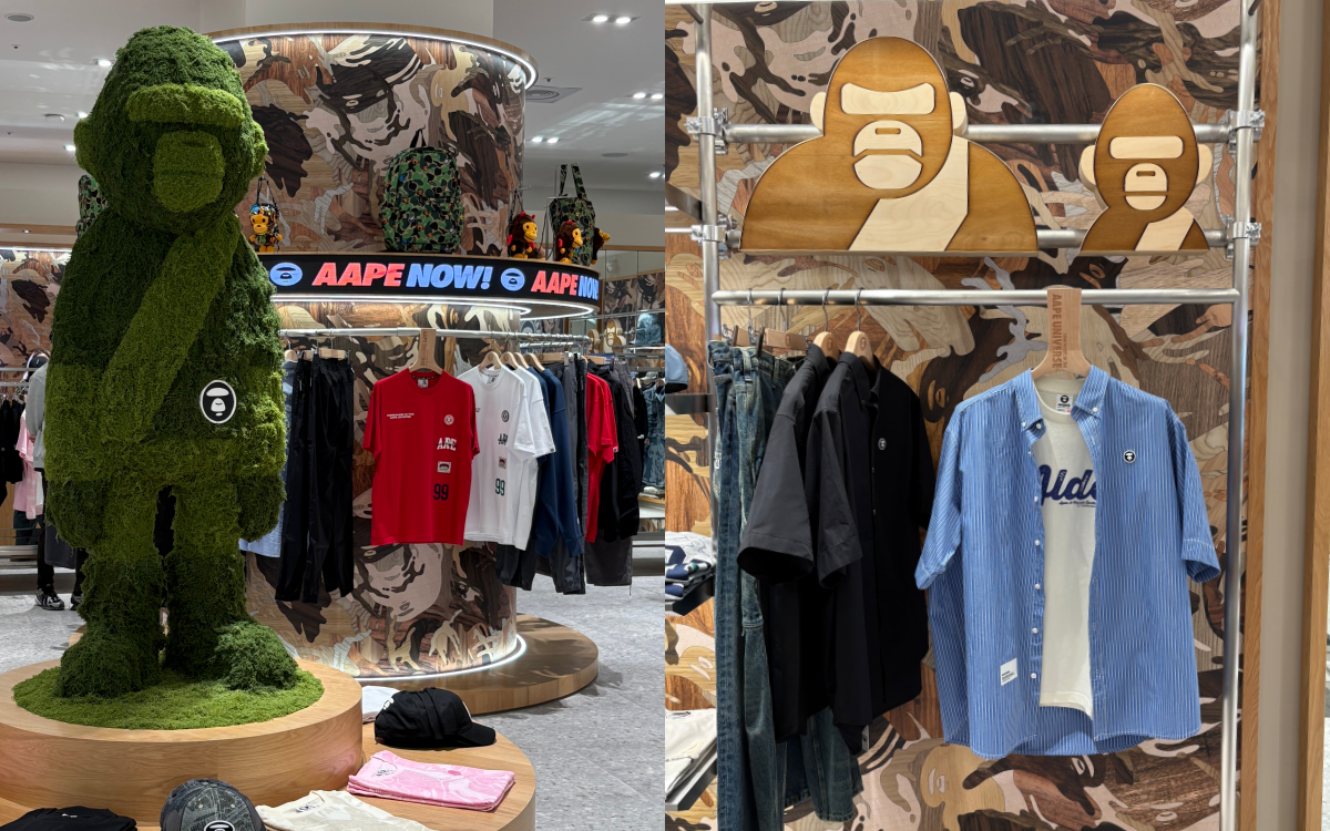 AAPE BY *A BATHING APE® 正式進駐台中全新購物地標「漢神洲際購物廣場」。今日開幕首日即湧現大批排隊人潮,展現不凡的潮流號召力。本次 AAPE 融合戶外休閒與都會時尚美學,並攜手 BABY MILO 釋放萌系魅力,打造嶄新的空間視覺,為中部潮人們帶來耳目一新的「猿力」體驗。