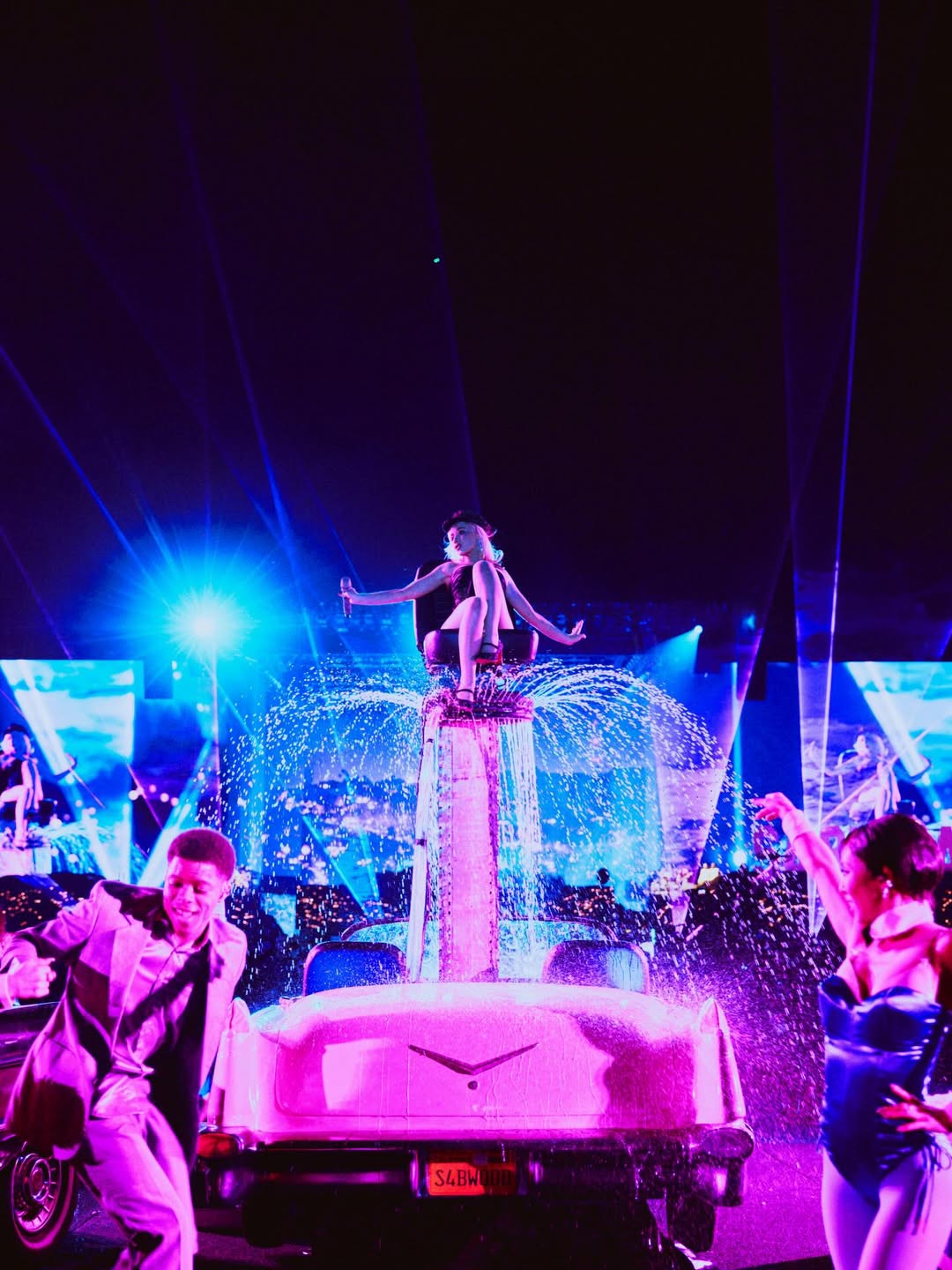 Sabrina Carpenter 這次的 Coachella 舞台一共分成五個部分,每一個舞台都是不同的造型搭配不同的視覺呈現,但不變的是滿滿的誠意和華麗感。尤其在表演最後一首歌〈Tears〉時,Sabrina 唱到一半時椅子甚至直接噴水升天,最後 Sabrina 在一段華麗的歌舞後,直接開了舞台上的車離開,無論視覺聽覺 Sabrina 絕對都以超高規格的領銜歌手等級在這屆 Coachella 立下了難以超越的標竿!