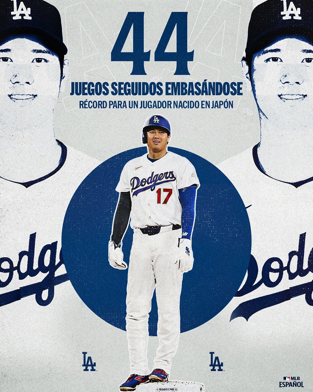大谷翔平前一天才剛從遊騎兵右投 Jack Leiter 手中敲出開場轟,今日再度發威,也將其傲視大聯盟的連續上壘紀錄推升至 46 場。目前他距離 Ron Cey(1975-76年)所保持的道奇隊現代棒球(1900年以來)隊史第四長連續上壘紀錄(47場)僅差 1 場。
