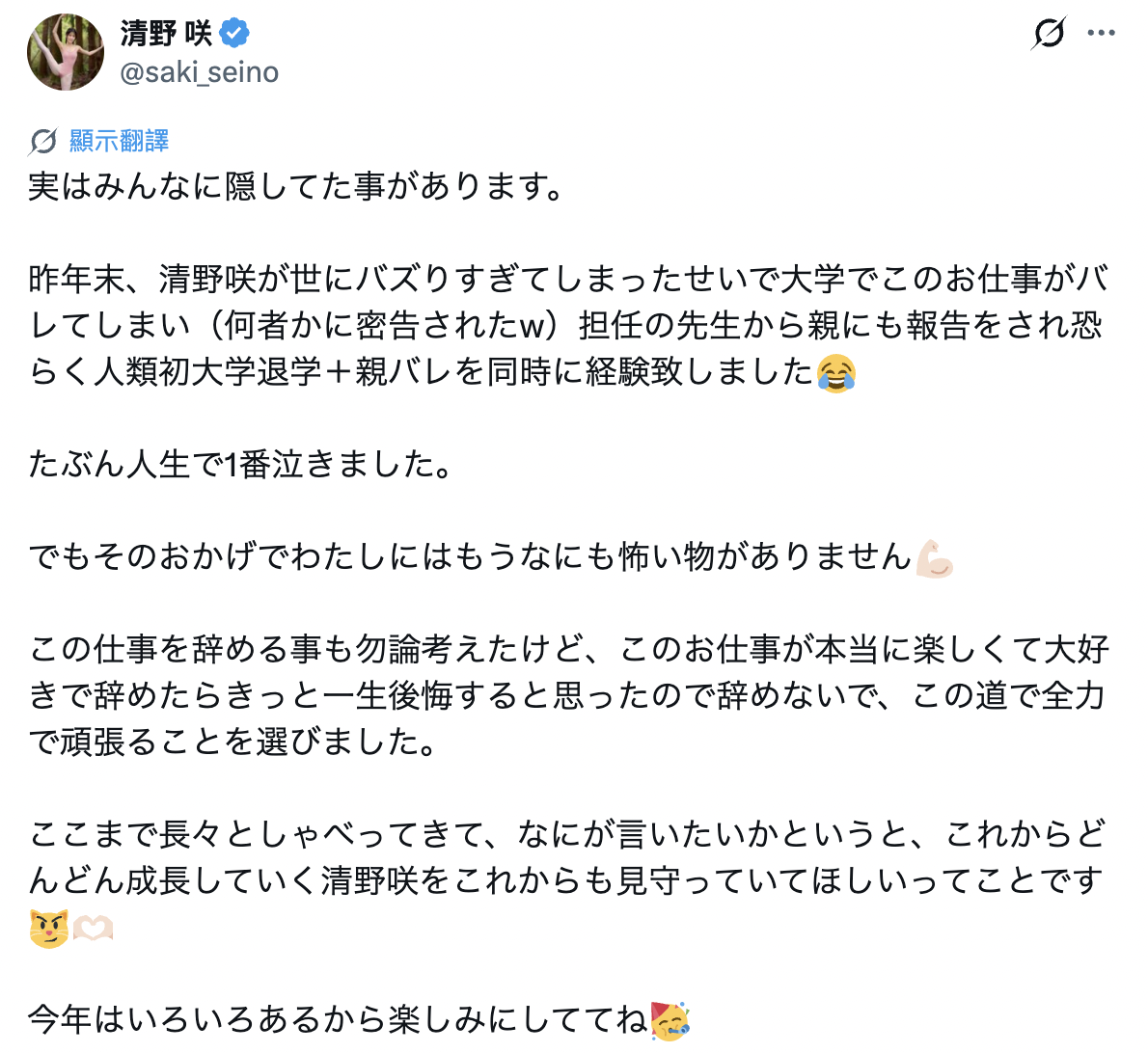 能知道,在 2025 年十月份正式現蹤的「清野咲」,不僅出道之際,因為 “芭蕾舞身份” 的關係,令其出道貼文、驚人地在 X(Twitter)平台累積突破 “3,600萬次” 查看,不久前,又因為 清野咲 po 出「大學退學」的文章,引發了粉絲們的高度關注。據 清野咲 所言,因為在 2025 年爆紅之緣故,讓其藝能身份被就讀科系的系導師知曉,而這不僅令 清野咲 遭到 “退學處分”,甚至該位系導師也一併告知了家長,而這突如其來的多個遭遇,便使得 清野咲 發文寫下「たぶん人生で1番泣きました。(意即:那大概是我人生哭得最慘的一次。)」文字,十足顯露出難過情緒。