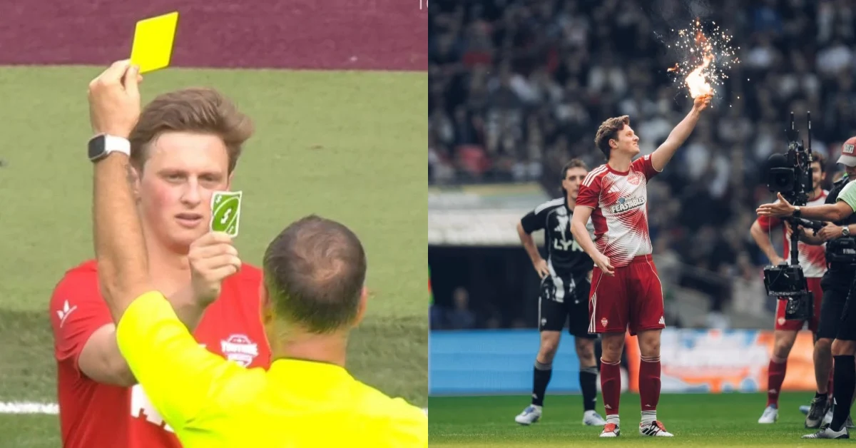 就愛跟黃牌過不去的英國百萬 YouTuber Max Fosh 又來了!在剛剛結束的 2026 年 Sidemen 慈善足球賽上,當主裁判 Mark Clattenburg 再次對 Max Fosh 出示黃牌時,這傢伙竟然當眾表演「焚燒黃牌」!