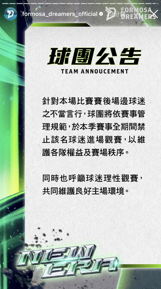 球迷衝上場事件在網路迅速發酵,許多網友都紛紛貼出影片,夢想家球團也緊急發聲明釋出懲處。貼出公告:「針對本場比賽賽後場邊球迷之不當言行,球團將依賽事管理規範,於本季賽事全期間禁止該名球迷進場觀賽,以維護各隊權益及賽場秩序。同時也呼籲球迷理性觀賽,共同維護良好主場環境。」