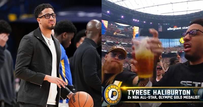 身為資深摔角迷的Haliburton ,今日出現在場邊第一排觀賽。當現場大螢幕捕捉到他時,這位溜馬隊球星先是做勢自己喉嚨不適,接著舉起手中的啤酒猶豫是否要一飲而盡。