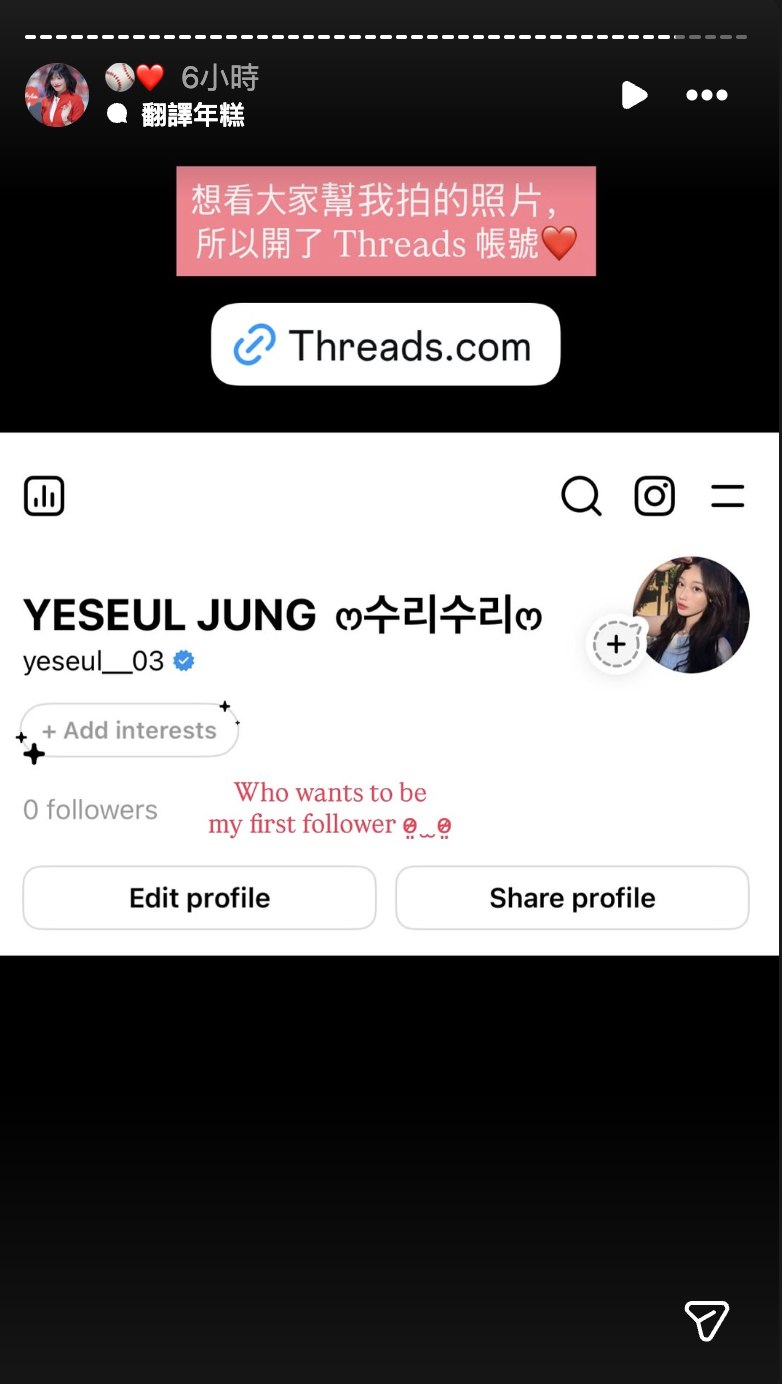 隨著人氣飆升,越來越多球迷分享關於 Yeseul Yung 的照片以及應援影片,為回應台灣球迷,她還特別開了台灣人愛用的 Threads,還與球迷開玩笑互動表示:「嗨嗨!me 是一位 22 歲的空服員,也是啦啦隊女孩(?)」短短 7 小時就獲得近 7,000 讚,球迷都在底下留言,「小龍女」小映也在底下回應:「超棒的👍🏻」。