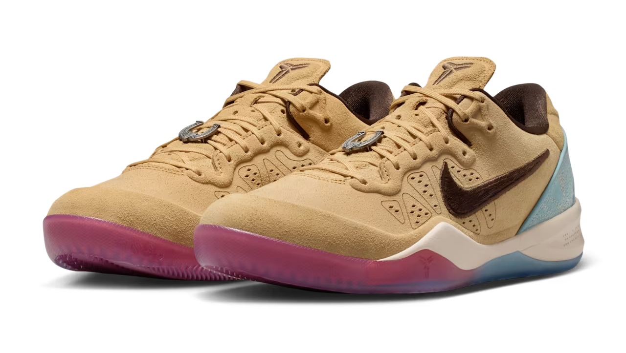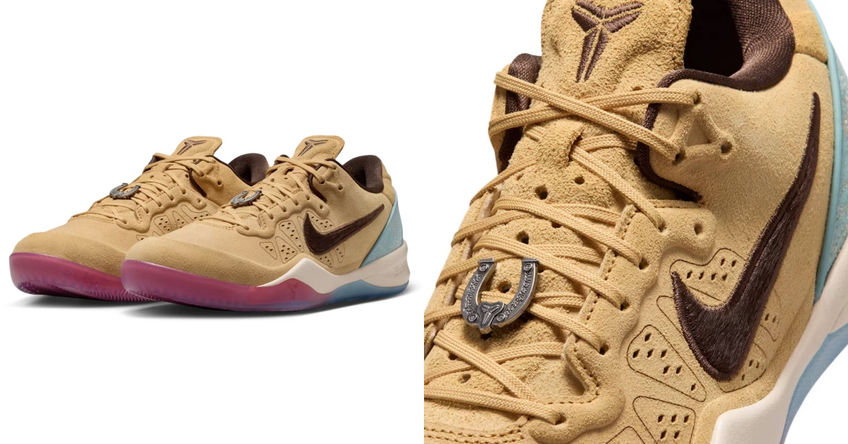 Nike Kobe 8 Protro “Siempre Hermanos” 從鞋名到配色都細節滿滿,2012 年 Kobe 與 Gasol 一起買下一匹賽馬,“Siempre Hermanos” 也是兩人共同擁有的賽馬名字。因此這次外型上,鞋款以天然麻繩色皮革為主調,搭配巴洛克深棕色馬毛細節,呼應馬毛視覺,營造出低調卻極具層次的質感。後跟則以結晶海藍色鞋套銜接冰感漸層外底,在沉穩之中帶出一抹亮點。最具故事性的細節,莫過於馬蹄鐵造型的鞋帶裝飾,上方點綴 Kobe 刀鞘標誌,兩側環繞「Siempre Hermanos」字樣,將情感與設計緊密扣合。