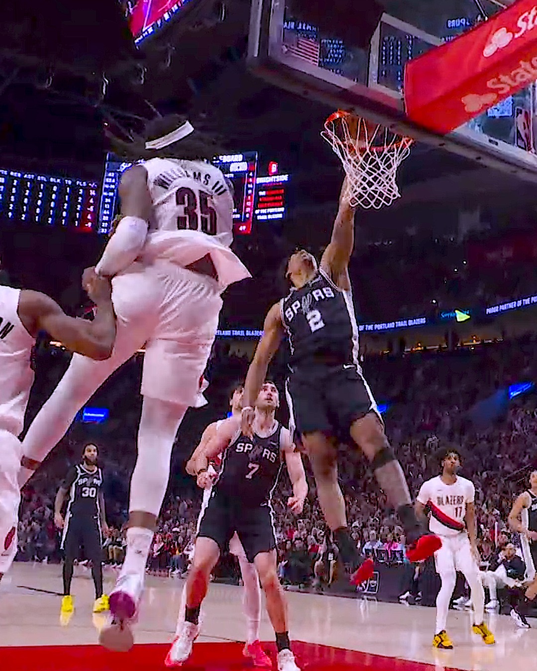 本場比賽的轉折點發生在第三節末段。拓荒者後衛 Scoot Henderson 在一次切入得分後對著 Dylan Harper 示威狂吼,被判技術犯規,這舉動徹底點燃了 Dylan Harper 的鬥志。