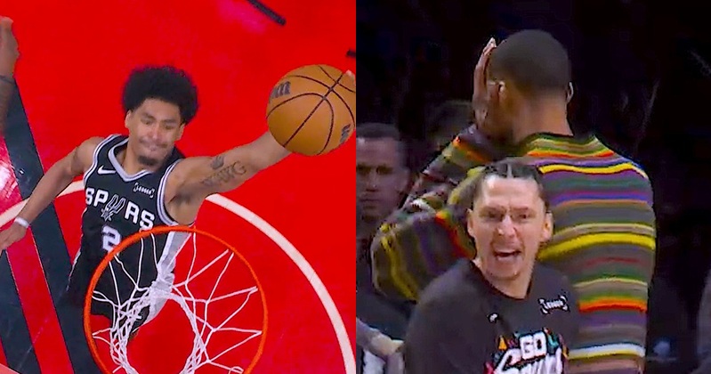 他在隨後的進攻中接管比賽,其中一記在 Robert Williams III 頭頂上的暴力隔扣,讓整個波特蘭主場陷入死寂。現場畫面捕捉到,缺陣的 Victor Wembanyama在場邊看到這一幕後露出不敢置信的神情。Dylan Harper 單節狂轟 10 分,帶領馬刺從最多 15 分的落後中逆轉勝。