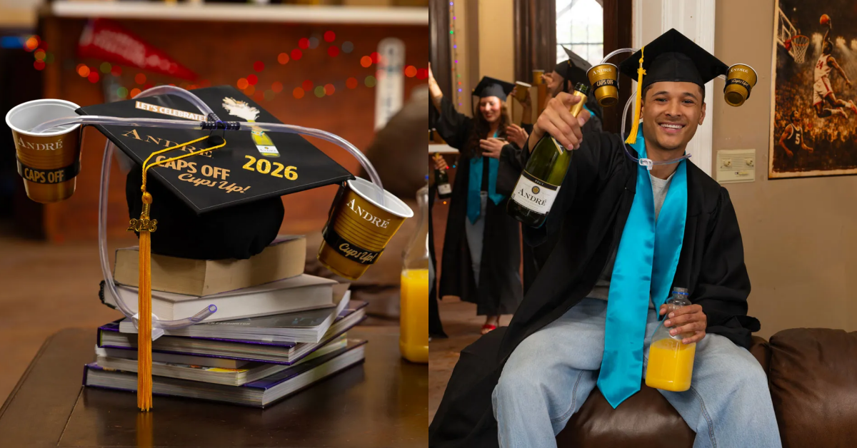 「喝汽水涼帽」實體化?香檳品牌打造腦洞大開的超狂學士帽,讓你邊典禮邊喝