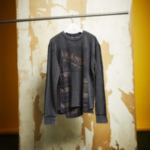 於局部不規則地採用格紋面料拼接,並大量運用不收邊設定細節處,再經過眾水洗加工處裡,散發強烈設計感。Slightly Numb大學T(Slightly Numb)。
