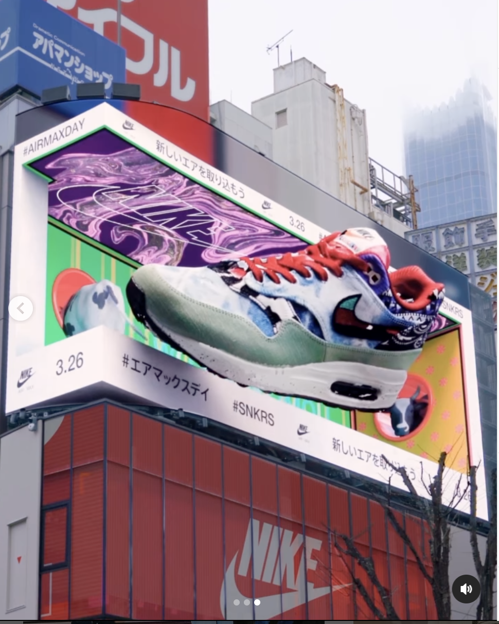 而為迎接到來的 Air Max Day,日本新宿街頭近期居然出現了一面超大的 Nike Air Max 3D 裸視牆,以超酷炫的視覺呈現一雙雙 2022 年版本的 Air Max,吸引不少街頭民眾停下腳步,拿出手機錄影朝聖。