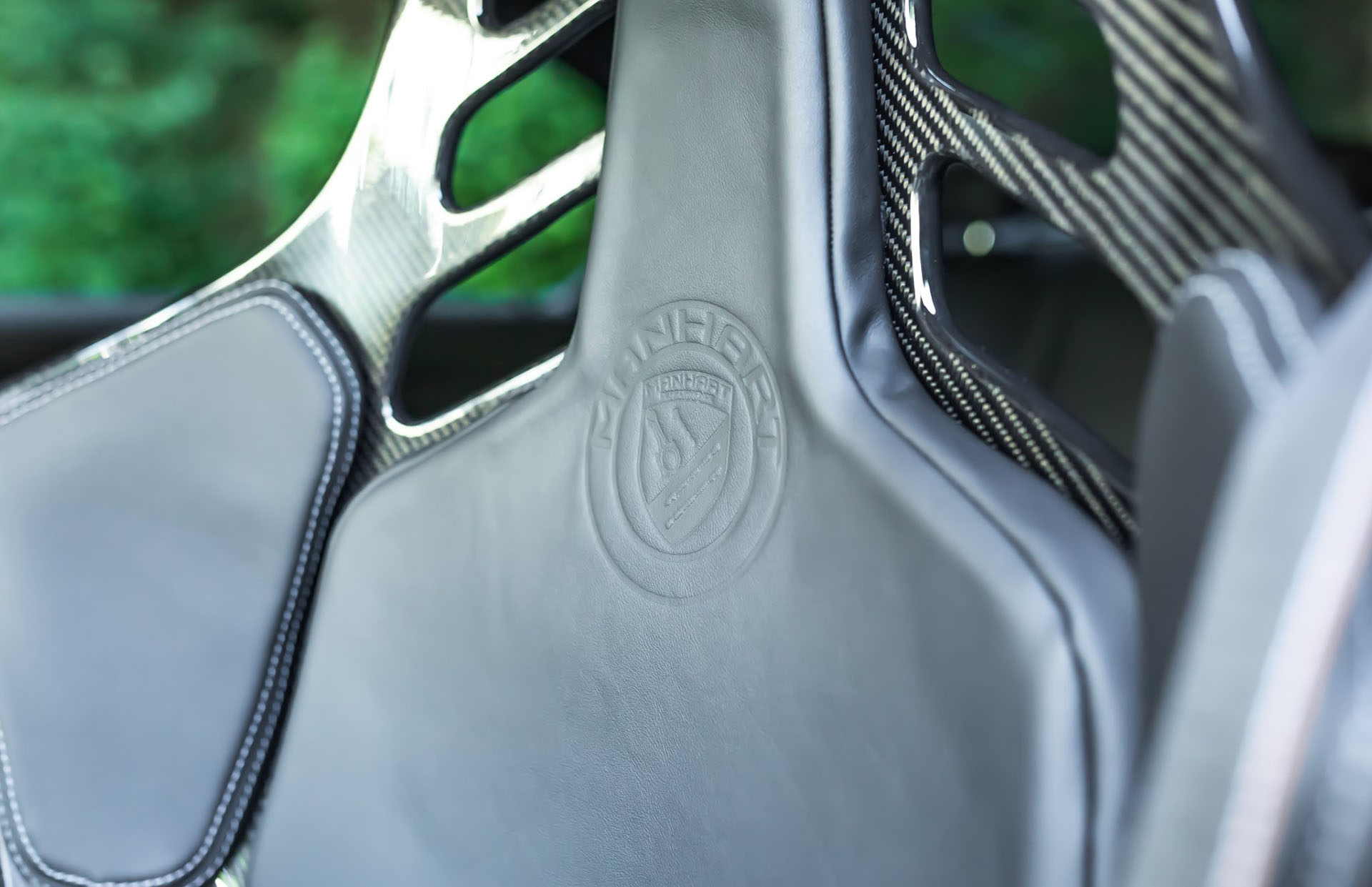 座艙內部除了維持 M3 Competition 原有風格,碳纖維飾板佈滿中控台和方向盤等處,並且將 BMW 廠徽改為 MANHART 自家 Logo 外,最大亮點肯定是前排那兩張 RECARO 賽車椅,全名為「RECARO Podium Carbon Seats」的碳纖維桶椅,一體式的設計、頭枕一樣有著 MANHART 壓紋標誌,搭上原有的 M 款三色安全帶口水流到地板全濕。