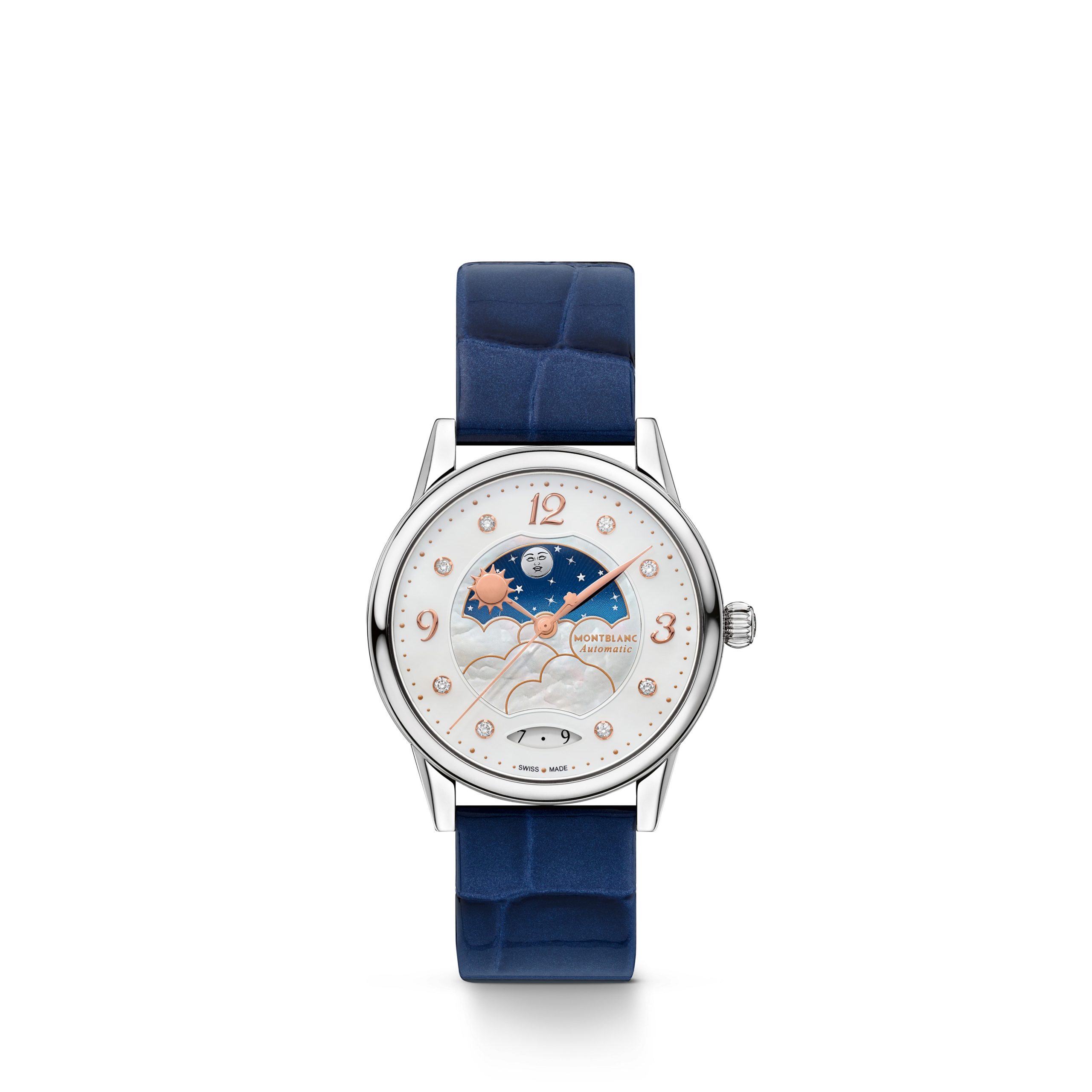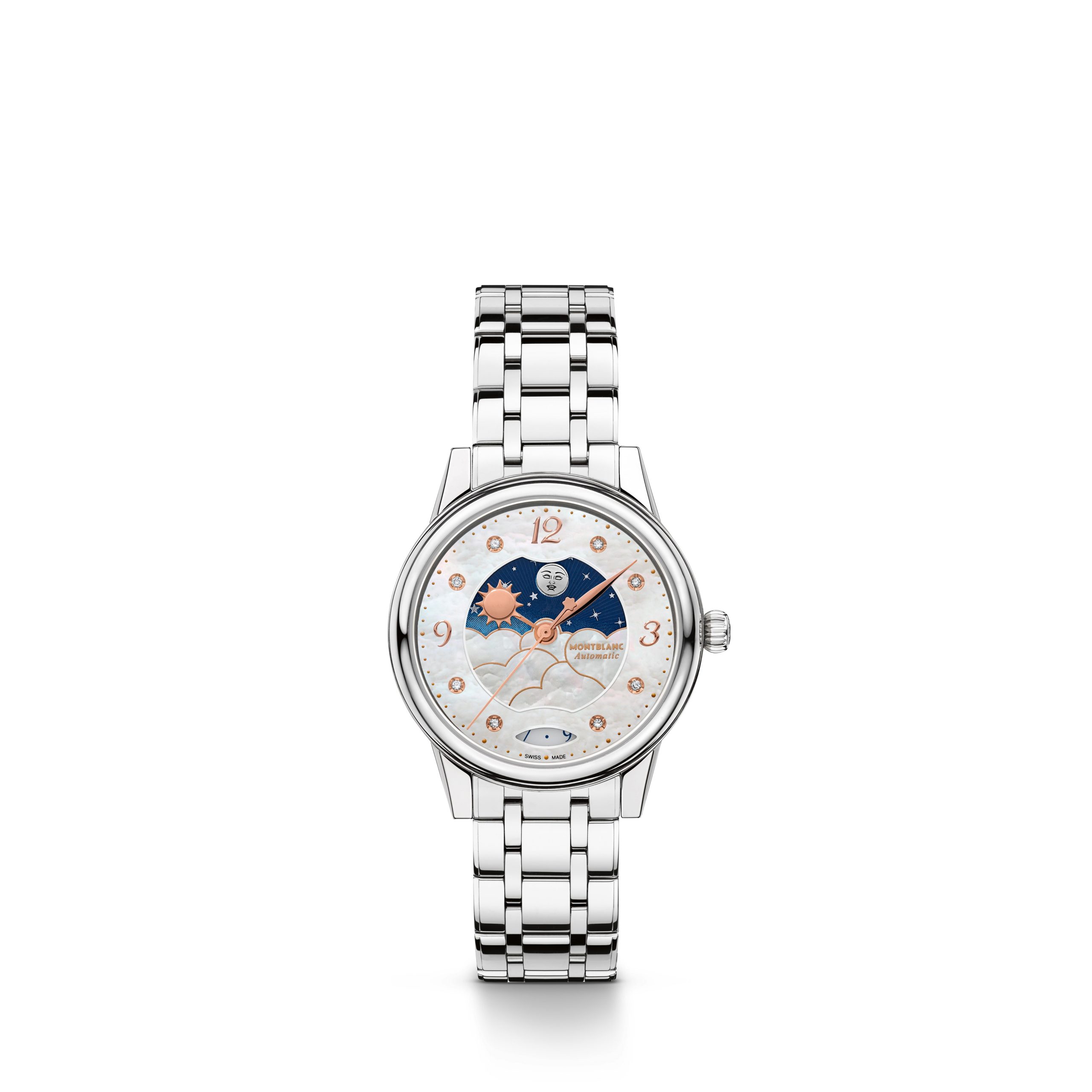細看腕錶,會注意到朵朵白雲是以呈現自然彩虹亮光的珍珠母貝製作,並以精緻的鍍玫瑰金線勾勒雲朵的輪廓。月亮的臉為鍍銠表面,散發銀色魅力,伴隨著如在夜空起舞的點點星辰。此外,腕錶搭配太陽造型的時針、葉形分針,以及飾有萬寶龍標誌的秒針。秒針上的品牌標誌就像一顆星星,運行時有如流星劃過長空。