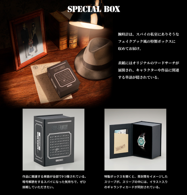 除此之外,手錶的包裝也是精心設計過,封面上藏著與作品息息相關的 9 個關鍵字句,粉絲們可以依循線索來解謎,整體採書衣的方式呈現,盒內還附有角色的卡片,以機密公文信封裝袋,裡裡外外都融入了作品的世界觀,這真的不敗不行啊!目前已在 PREMICO 官網上開放預購,價格為 32,800 日圓,預計於 2022 年 12 月中旬開始販售,由於有限量的關係,喜歡的粉絲一定要趕緊上官網入手!