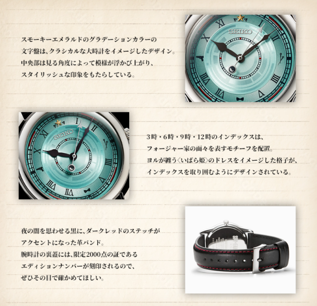 手錶以湖水綠作為底色,表面上的數字特色取自佛家一家的角色象徵,12 點鐘為安妮亞最具代表的「髮飾」,同時也有黃昏最希望安妮亞得到的「星星」(笑);3 點鐘方向則是媽媽 約兒所持的武器「格檔匕首」;6 點鐘方向則為近期在動畫登場的新成員狗狗彭德的「領結」;最後是 9 點鐘方向,爸爸洛伊德所持的「手槍」,秒針上也暗藏玄機,有著組織「WISE」的標誌,最後是整體錶面,上頭有個神祕圖騰是需要改變角度才看得到的,外圍的設計其實是來自約兒在「出任務」時身穿的禮服,一切得巧思實在是優雅、太優雅了!