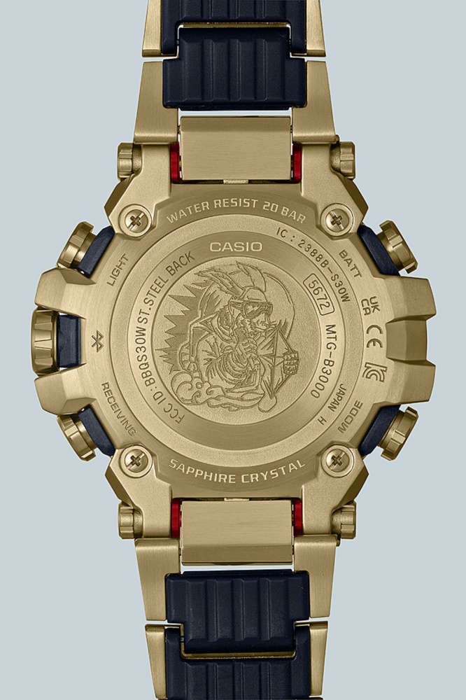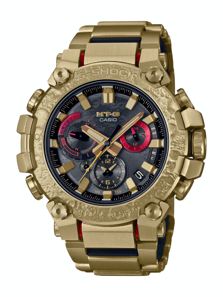 G-SHOCK 全新肖主題系列錶款錶款以 MTG-B3000 為基礎型號,金屬錶殼、錶圈與外側錶帶經金色IP處理的金屬錶帶,展現高端精緻的質感,內側錶帶則採用樹脂材料增添配戴舒適度,減輕整體錶帶重量外,也減少冬天配戴的冰冷感,搭配防刮抗磨損的藍寶石水晶玻璃鏡面提高清晰度。