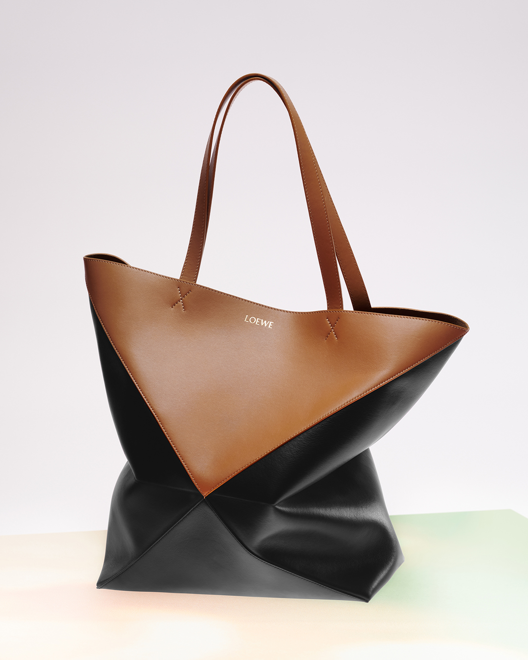 秋冬廣告形象展示雙色 Puzzle Fold 托特包、鮮紅色磨菇圖騰 Puzzle 肩背提包、Cubi 斜肩 包、Campo 黑色小牛皮綁帶皮鞋及多款精美小皮件。