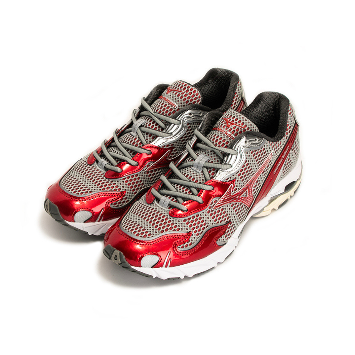 「Flame Wave」系列中的聯名鞋履以 Mizuno 的經典鞋款 Wave Rider 10 為發想藍本。Wave Rider 10 於 2006 年首度問世,複合式波浪片一口氣整合尼龍、可塑性聚酯胺及衝擊吸收材料 VS-1,提供足部柔軟舒適的支撐力,橡膠大底具有良好的抓地力,多孔網布面料及多層次結構則呈現千禧跑鞋精髓,完美揉合專業慢跑鞋科技與復古休閒風格,並憑著前衛輪廓在當時引起廣大矚目,不但奠定了其獨特美學地位,也成為許多品牌爭相合作的鞋款型號。