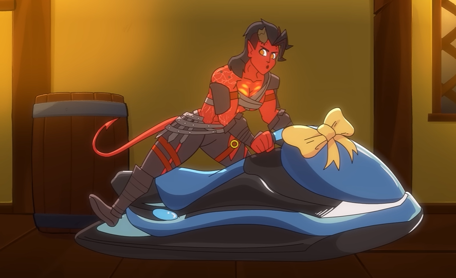 回到了酒館之後,可以看到蓋爾正在逗他的翼貓,威爾在玩他的刺劍、卡菈克在嘗試發動雪上摩托車、養雞妹收到 Geoff 給的禮物,是奪心魔的大腦,全片都是板著臉的他瞬間變成水汪汪的大眼並感謝 Geoff 送給他這份大禮(此時的 Geoff 還戴上聖誕帽),阿斯代倫穿上專屬的聖誕衣袍。